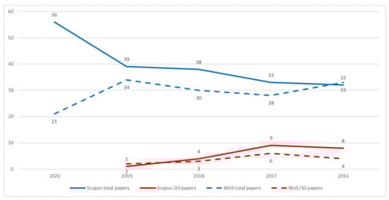 Number of i10 articles on teacher effectiveness in the last five years in relation to total academic articles in the Scopus and WoS databases.