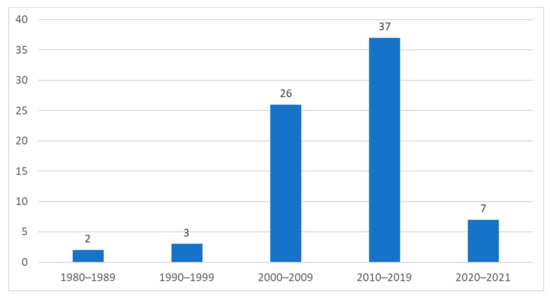The works included in this review have received 32,633 citations in Google Scholar (some works were not included in any of the three databases consulted: WoS, Scopus, and ERIC, which made it necessary to collect the number of citations using Google Scholar as a source of comparison), with an average number of M = 435.11 citations per study. It must be noted that all studies included in this review have been cited in Google Scholar, including those published in 2021, shortly before the completion of this work. The two least cited papers (one Google Scholar citation) were published for less than one year at the time that this review article was written. In contrast, the most frequently cited paper has been cited 7511 times in the last fifteen years. Regarding the distribution of citations according to the year of publication, Figure 5 shows the average number of citations per academic paper in each period. It is possible to observe how the decade of the 90s shows an impressive average of M = 1006 citations per paper, and the decade of 2000s shows an impressive average of M = 872.42 citations. However, the works published in the last two years, with much less margin for reviewing by the scientific community, show a magnificent average of M = 64.43 citations per academic paper.