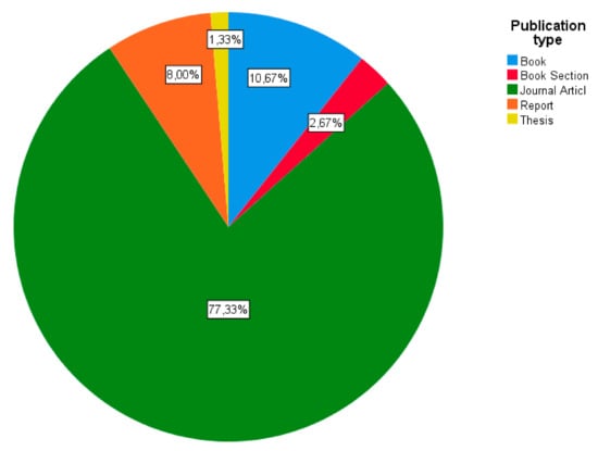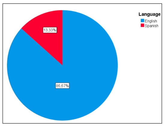Finally, this theoretical review includes 75 studies, 7 of which were published in 2020, as seen in Figure 2. Of the selected studies, 77.33% are academic journal articles, as shown in Figure 3. Academic publications in English and Spanish have been included (13.33%), as seen in Figure 4, as these are the languages spoken by the authors and the most relevant within the academic area reviewed.