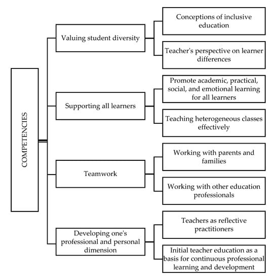 This report shows that interpersonal and collaborative competencies are essential for working with other professionals and with the family in order to respond appropriately to educational needs. In addition, there is a need for lifelong learning and initial training that addresses the development of attitudes and values that are fundamental to inclusion. Institutions that train teachers and professors need to collaborate to ensure the implementation of appropriate educational models—models that include interaction with people with needs, as this is a fundamental element for the improvement of training quality at both the theoretical and practical level [21]. From this project, a teacher profile for inclusive education was derived based on four competencies: valuing student diversity; supporting all students; working as part of a team; and developing one’s own professional and personal qualities. These competencies are then divided into different competency areas, as can be seen in Figure 1.