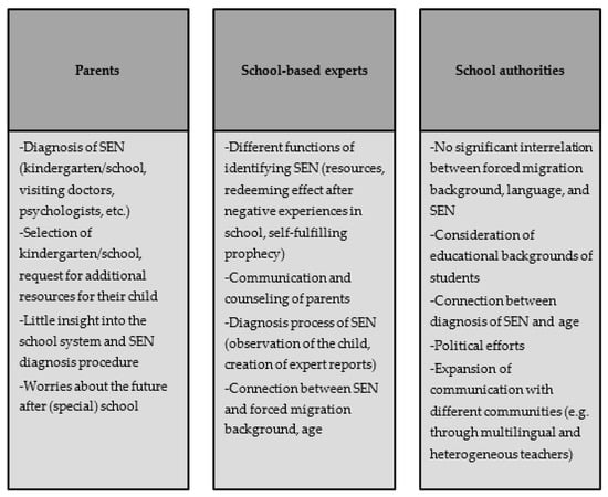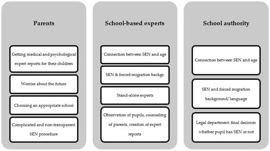 The participants were guaranteed confidentiality and anonymity by the researchers through an informed consent form. Data collection started with obtaining the signed informed consent from the participants. The consent form was explained in detail to the parents in case they needed help understanding this formal document. The suggested ethical procedures of the institution employing the researchers were followed. Data were stored in a password-protected external hard disk that only the researchers had access to. No one other than the researchers was involved in the transcription or analysis of the data. The first five interviews were audiotaped, partly transcribed, anonymized, and analyzed simultaneously. The initial interview with a representative of the Vienna School Board was intended to set the scene and identify main issues of concern as the subject matter was embedded in a variety of different political developments at the time that involved ongoing administrative reforms. This interview was analyzed in accordance with thematic analysis by Mayring [] in order to reduce data [], get a general data-driven thematic overview as well as derive relevant dimensions/categories for the development of a coding frame focused on the intersection. From these main categories, the guidelines for the four semi-structured interviews with parents and school-based experts were derived with the process of identifying, diagnosing, and labeling students with SEN at the center of interest. These were analyzed applying a coding procedure according to Schmidt []. This method is well-suited for the analysis of guideline-based interviews and covers both the deductive coding process as well as the interpretative angle. While the initial analysis with Mayring opened up the research field and showed the broadness and complexity of the data obtained, the research process showed the methodical need for interpretational elements. The combination of both methods allowed the data to gain both broadness and depth. The findings from the two additional interviews were used to contrast and complement the findings. Figure 1 depicts an overview of the main topics identified from the analysis process for the different groups.