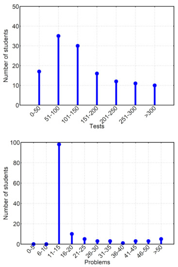 The number of numerical problems done by the students is much lower than that of quizzes. Not only were they available in less quantity, but required more time, were harder to solve and, overall, the capacity to solve such problems was not evaluated until the end of the course. The limited use of the available online numerical problems as a tool for formative assessment is unfortunate because problem-solving require a different set of skills and cognitive skills than common quizzes [37], where the work with data or formulas is very limited, and that work is important to reach all the goals listed in the syllabus.