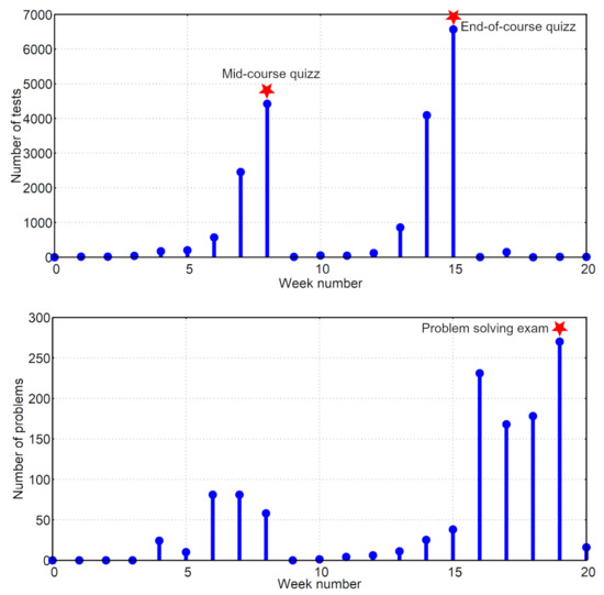 Although unfortunate, this is the typical behavior of students if effective measures to avoid academic procrastination are not implemented in the class [38]. The level of procrastination varies from 50 to 90% according to different authors [39,40] or even more [41]. In this case, if the level of procrastination is calculated as the number of quizzes done during the 2 weeks before each exam divided by the total number of quizzes, procrastination reaches nearly 90%. This is not how procrastination percentage is usually calculated (using self-reports about executive functioning [42]), but gives a good image of the problem because 4 weeks (two weeks before each quiz exam) accounts for around 23.5% of the course duration, including non-teaching weeks.