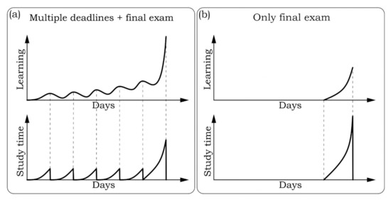 The effect of procrastination is usually stress [43] and a lower learning level [44] With these facts in mind, it is advisable to implement multiple deadlines along the course so that the curve of learning and time dedicated to study changes significantly, as shown in Figure 3.