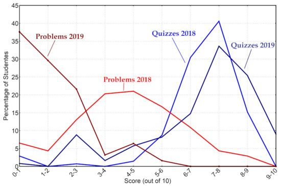 The change in the scores associated with the new assessment is not due to part of the students, but to a general change in student self-regulation that had to be studied and was not due to procrastination. This was the first year the students had online quizzes and problems at their disposal to use as formative assessment, so, an increase in scores was expected (as usual, written questions in the textbook were also available). This happened in the quizzes, but not in the numerical problems. Figure 5 shows this effect in a comparison with the scores of the prior course.