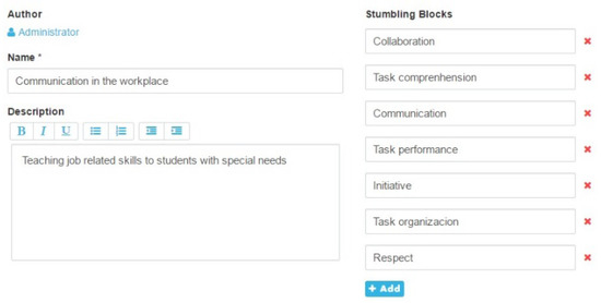 However, it seems that developers and researchers [4,8,9,10] are directing their efforts towards the development of applications for handheld devices that can satisfy particular needs in particular scenarios. However, implementing specific apps and providing them with content is a daunting task that involves a costly process and a great amount of time to analyze, plan, execute, test and maintain an application that is designed to satisfy only one concrete requirement. For this reason, some researchers are studying ways of teaching job-related skills to people with intellectual disabilities through learning management systems (LMS) that can be customized for different user profiles [11] and help provide different learning resources according to the user’s disabilities, learning goals and preferences [12]. However, people with any sort of disability are usually excluded from e-learning communities since platforms are not usually designed according to the Web Accessibility Initiative Guidelines [13].