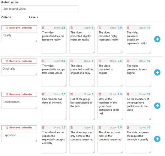 Once the students submit the final result of their work, they can make the video public for the other groups. At his moment, the rest of the members of the other groups can provide feedback about the submitted videos, being able to provide constructive comments. In addition, the teacher may set up a rubric that the students can use in order to score the videos (See example in Figure 2) Both ways of evaluating (comments and rubric) are based on the threshold concept and the associated stumbling blocks. ClipIt guides students during the commenting process through the rubrics provided by the instructor. All the reviews of the video are available to its creators, so they can improve the video thanks to the feedback obtained from their classmates.