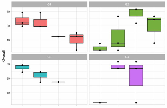 Afterwards, we have to transform all the dimensions into only one indicator, which will be called Overall, which will help us to calculate the scores for each video. The results are shown in Table 6. According to this data, G1 and G4 obtained similar scores, G3 obtained the best score and G2 obtained the worst score.