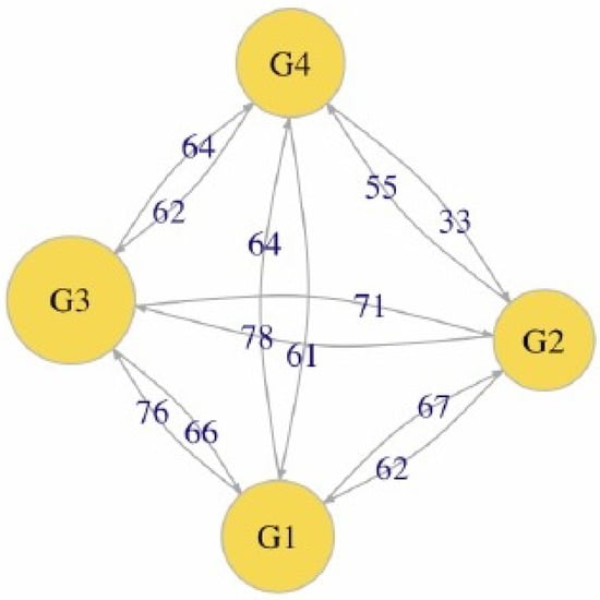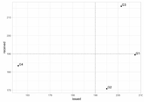 If we focus on the scores given between each group (Figure 6), we can see that the scores are similar, except between G2 and G4. In this scenario, reciprocity is higher in all the cases, which is evidence that there was no strategic vote in which one group voted low to hinder the rest, or that they voted low for one group because they did not like each other.