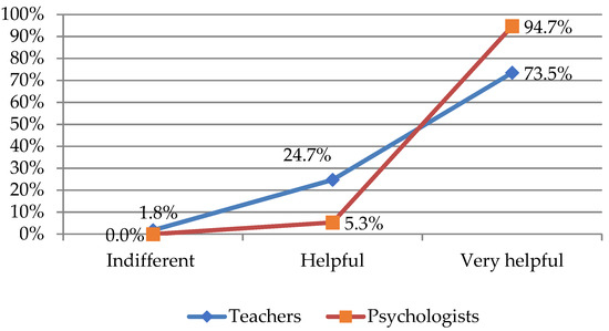 The majority of the teachers (n = 205; 73.5%; SD = 0.49) and psychologists (n = 54; 94.7%) in the sample assessed the provision of the school psychological support services as very helpful, while 24.7% (n = 69) of the teachers thought that this work was helpful. Only three psychologists (5.3%; SD = 0.22) considered their work to be useful in the school context. Therefore, the higher frequency of reports by both teachers and school psychologists themselves confirms the importance and usefulness of school psychologists throughout the school community and this can also be seen in Figure 1.