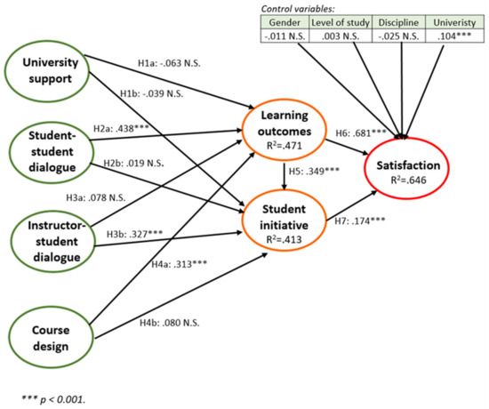 The structural models were evaluated by the size and significance of the path coefficients, and R2. As illustrated in Figure 2, the R2 values represent the amount of explained variance of the endogenous constructs in the structural model, which determines the structural model’s predictive power [53]. Figure 2 shows that the R2 values of learning outcomes (0.471) and student initiative (0.413) were satisfactory. The R2 value of satisfaction (0.646) also showed adequate predictive power in the resulting structural model [58], proving that approximately 64.6% of the variance of satisfaction was explained by the model. The significance and size of the path coefficients are summarized in Table 4.