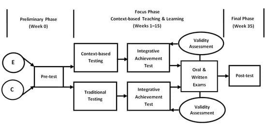 This study was conducted using the pre/post-test design involving a control group and an experimental group. The entire time span of the experiment was 35 weeks including a 15-week program followed by a delayed post-test after 20 weeks. The experiment was divided into three phases: preliminary, focus, and final. The duration of the Analytical Chemistry (context-based) course was one term (15 weeks). Test data were gathered at three points: start-of-course (or the preliminary phase), end-of-course (or the focus phase) (end of Week 15), and after-course (or the final phase) (end of Week 35). The time gap between the focus and final phases was 20 weeks. Figure 2 illustrates the timeline and sequence of the experiment.