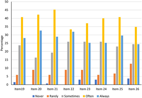 On the other hand, Figure 3 shows that the items most related to motivation (items 20 and 22) and to easy access to the resources that students need (item 25) have a clear bias toward agreement since answer 1 (Never) has a value of 0 in all of them. Very close to this value, item 21 stands out since only one of the respondents (0.7%) thought that the use of digital resources in their learning never favored their level of security and confidence during the development of their school activities.