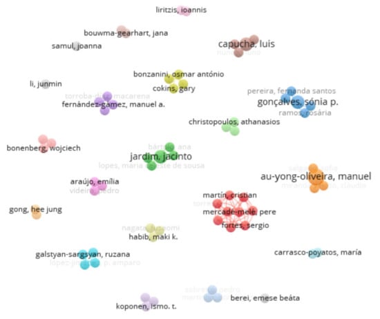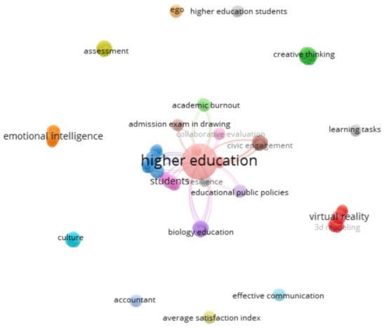 Regarding the keywords (Figure 2), there is a strong link strength between several keywords, based on equal distance. Higher education is the strongest keyword represented in the network. However, there are several keywords without association, represented in the orbit of the network. These are: higher education students; virtual reality; learning tasks; creative thinking; assessment; emotional intelligence; culture; and effective communication.