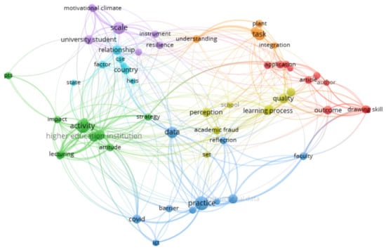The network regarding research attributes and expressions in title and abstract (Figure 3) is more complex, and represents six clusters. The purple cluster is related to the motivational climate and the university students, the orange cluster is related with tasks and integration, the red cluster is focused on the application and the outcomes of education, the yellow cluster is focused on the learning process and quality, the green cluster is related to impact and attitude in relation to higher education, and the dark blue cluster is related to the faculty, the practice and the COVID-19 context.