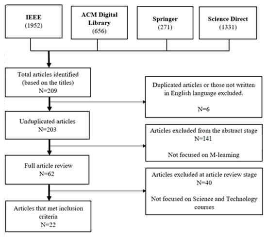 In total, 4210 were found across four databases. Specifically, 1952, 656, 271, and 1331 articles were retrieved from the IEEE, ACM Digital Library, Springer, and ScienceDirect, respectively. The titles of the articles were then skimmed through, and 209 articles were selected based on relevance, with 107 from IEEE, 28 from ACM Digital Library, 59 from Springer, and 12 from ScienceDirect. Subsequently, reading through the abstract, 62 articles were selected for further analysis. Only articles that were examined during the pandemic period with a focus on Science and Technology were chosen from the M-learning articles.