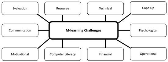 In addition, learners lack passion and are easily overwhelmed when it comes to formal education through the Internet [56]. Both educators and learners are unable to maintain sustained attention for a prolonged length of time. Concentrating on the lecture is a challenge for learners if the lecture was not interactive and the lecturer lacked the necessary skills to attract learners’ attention [32,41]. Figure 4 summarizes all of the identified M-learning issues.