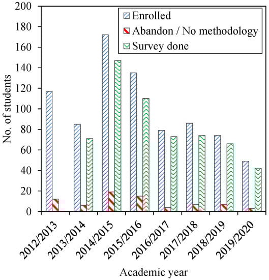 This subject was introduced in the Civil Engineering Degree as a result of the implementation of the Bologna Process. The first academic year in which it was taught was 2012/2013. That year, a traditional approach based on a completely teacher-centred methodology was used. Implementation of the described learning methodology started in the second academic year, i.e., the year 2013/2014, and lasted 7 years, up to the academic year 2019/2020. Thus, the first year may be used as a “reference year”.