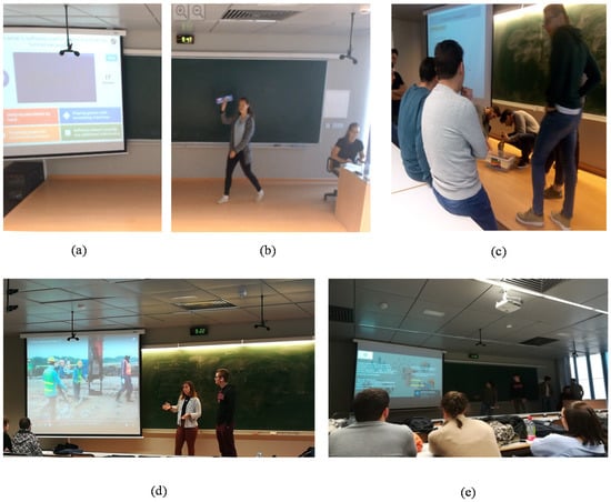 The work of both students and teachers made it possible that all groups participating in this experience (over the 7 years) achieved their objective of preparing and delivering a real lecture. Figure 3 illustrates a series of the class’ examples of students giving lectures and developing really interesting activities. For instance, Figure 3a,b show the students of the group responsible for teaching a class related to tunnel design conducting a “Kahoot” to check the attention and knowledge of their classmates after their lecture and awarding the winner with a chocolate tablet. Figure 3c shows a completely different approach: the topic “dynamic soil compaction” is taught through a real simulation prepared by the students of the group so that their classmates could understand it by experimenting and playing with the basics of this technique, as well as the effects that it brings when it is applied on a real ground. Finally, Figure 3d,e demonstrate how students themselves are the teachers of the lectures, and use videos, the blackboard and other digital resources to conduct it.