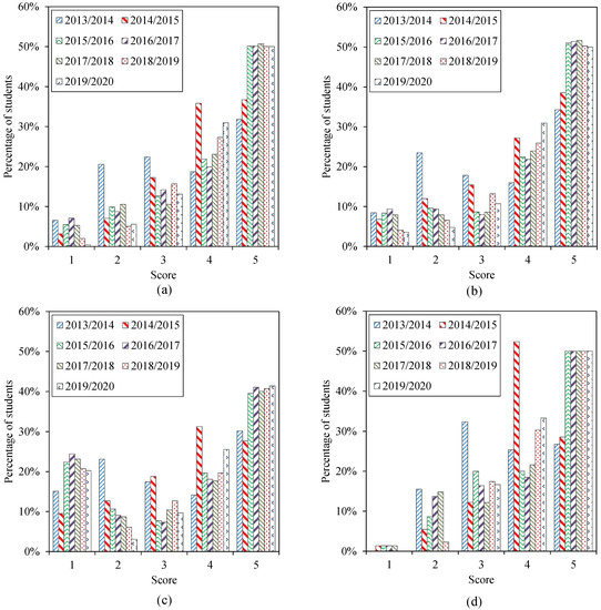 Table 3 summarizes the results of the survey conducted at each year when the methodology was applied indicating the percentage of students who chose a given score for a question. As stated above, each question score ranges from 1 to 5, with the higher the score, the higher the agreement with the question.