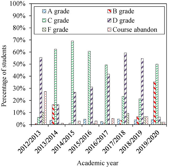 The reference year academic results show that more than 50% of students reached D grades, whilst the number of C grades was low. Only 1% obtained a B grade and none of them achieved an A. About 6% of students failed (F grade), and course abandonment was about 25%, which may be considered high. Thus, in total, more than a third of students did not pass the subject. Implementation of the new methodology introduced changes in this scenario. The most important aspect was the drastic decrease in the number of students who abandoned the course or did not pass. Thus, course abandonment was reduced to a maximum of 7%, and F grades nearly disappeared.