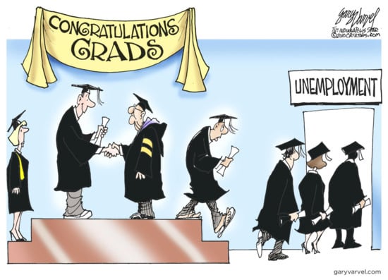 `Degree, Dole and Debt [100]. A cartoon [101] illustrating the `flow’ of UK graduates from a graduation ceremony to unemployment after having been burdened with an average debt of the order of GBP 50,000 in student fees, accommodation and other living costs, often for the privilege of being able to receive nothing more than a `Mickey Mouse Degree’.
