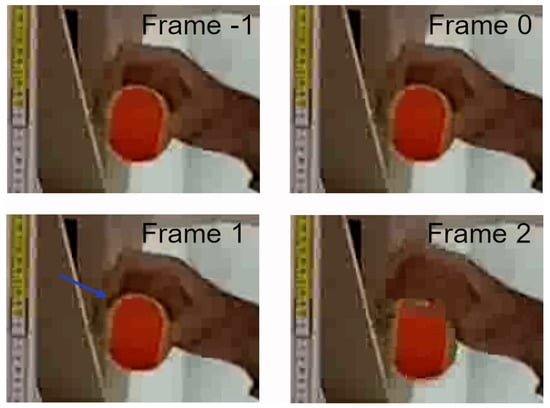 Picture of the frames across the ball release. Frame −1 and Frame 0 are the last two frames showing the ball held in the hand. Frame 1 show a space, evidenced by the blue arrow, between the hand and the ball, indicating the hand opening and Frame 2 clearly show that the ball has been fully released and is already moving.