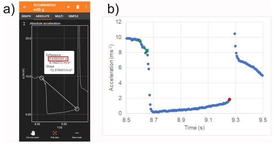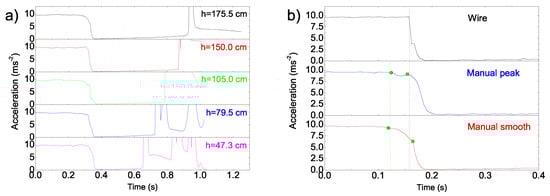 Concerning the falling time determined from the accelerometer data we observe that (see Figure 3 and Figure 6a) the final impact always determined a sudden acceleration increase, thus making easy the determination of the final instant in correspondence of the last point before the acceleration increase. On the contrary, the initial acceleration decrease is much smoother (see Figure 3b and Figure 6b) and it is thus not obvious which is the instant corresponding to the free fall beginning. We thus initially assumed that the smartphone release instant coincides with the instant of beginning of the acceleration decrease (green dot in Figure 3b and Figure 6b, corresponding to the last point before the initial acceleration decrease), but we observed that this choice leads to systematically overestimate the falling time of about 30–50 ms (with respect to the value calculated from Equation (2) with g = 9.8020 ms).