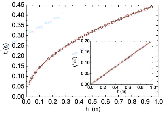 Falling time dependence on the starting height for the steel ball used in the 3B-Scientific set-up. The red line is the best fit curve with Equation (4). Inset: the same data re-plotted with on the vertical axis, evidencing a nice linear increase, expected for a uniformly accelerated fall.