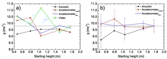 - From Equation (4) by using the average value of the falling time obtained, for each starting height, by repeating the measurements three times (for acoustic stopwatch and accelerometer methods). In this case g can be determined for each starting height with an estimate of the error bar.