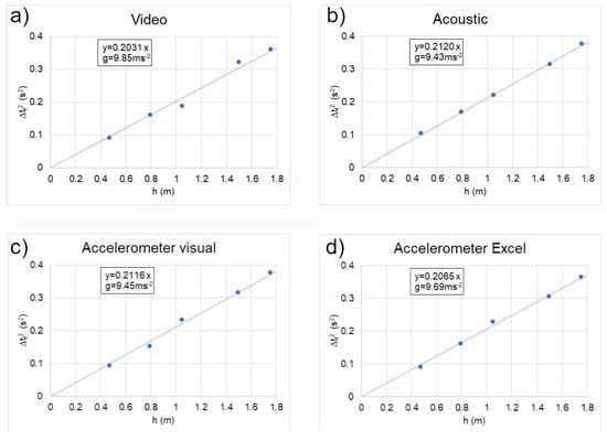 The simple analysis is performed by plotting with Excel the squared values as a function of h that, according to Equation (3), should show a linear dependence with slope 2/g. We first analyzed the data obtained by a single measure for each h, observing (see Figure 8), for all the investigated methods, a visually good linear increase, thus qualitatively confirming the motion with uniform acceleration. A simple linear regression allows to determine the best value of the slope and, thus, the best estimate of g. Even if Excel does not estimate any error bar for the best fit parameters, the regression on five points allows to compensate the effects of scattered values of on the value of g, thus leading to best g estimates most of the time quite close to the expected values. In particular, the relative accuracy of the g value obtained from the video (see Figure 8a) is = 99.5%, and also the values obtained by using the accelerometer differ from the expected value of less than 4% ( = 96.4% for the values directly extracted from the screen and = 99.8% when the extracted with Excel are used). On the contrary the systematic, and rather regular, overestimation of with the acoustic chronometer leads in this case to an underestimated g value (9.43 ms, thus = 96.2%).