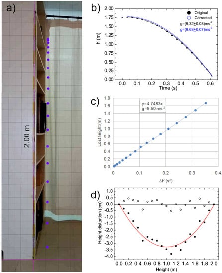 The pixel-length calibration has been instead checked by exploiting the presence of the meter in the video and determining the pixels corresponding to the meter change of color (from yellow to white and viceversa, every 10 cm). We thus compared the height values obtained from the pixel-position calibration () with the corresponding values read on the meter (), observing (see Figure 9d) a clear systematic difference down to about −4 cm for 1 m (the two values at h = 2.000 m and h = 0.000 m are the same by construction of the calibration stick).