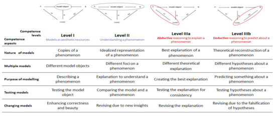Descriptions in level IIIa and IIIb indicate an understanding of modeling in the context of scientific investigations, which means the ability to assess models in their construction and application as research tools, which is a methodological perspective [6,7,10,11]. Level IIIa describes the ability to construct a model that provides the best plausible explanation for unknown phenomena which is free of contradictions to previous theories and explorations. Modeling is thus already a theoretical or creative process in model construction, which, associated with uncertainty, represents knowledge about a phenomenon, and can offer new possibilities for explanation. Level IIIb describes the ability to apply a model as a tool for investigating a phenomenon within scientific reasoning to empirically test its validity in the hypothetico-deductive approach; the model object as a model for something leads to processing new, thus far unexplained scientific questions.