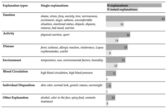 Our work aims to obtain insight into abductive reasoning within modeling processes in biological contexts. Based on Sturm [55], the reddened face phenomenon was used to obtain insight into abductive reasoning with regard to the FMC’s competence descriptions [6]. Regarding this, 32 pre-service biology teachers created concept maps to solve the problem of why a fictitious person, whom they cannot talk to, has a reddened face. The participants generated abductive explanations and strategies for testing these explanations (Figure 4). A total of 159 explanations were summarized into 39 types of explanations for the reddened face. It turns out that the reddened face scenario promotes students to select different explanations by abductive reasoning. Most of the 39 given explanations were further condensed into six superior explanation types “Emotion”, “Activity”, “Disease”, “Environment”, “Blood Circulation”, and “Individual Disposition” (Figure 4).