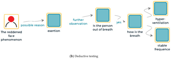 Students’ solutions for the reddened face phenomenon were structured into three different groups. In the first group, possible explanations were simply guessed without any testing strategy (n = 12). This result does not fit to our expectation that abductive explanations in model construction foster the switch into deductive testing in model application on its own. On the other hand, this result may be related to the fact that there were no possibilities to interact with the fictitious person nor the phenomenon itself. Thus, there was no feedback or interactive offer to test explanations. Nonetheless, most concept maps (n = 20) provided indicators aiming to test abducted explanations. Among these, two different strategies were identified. The first strategy in the sense of abductive testing (n = 7, Figure 5a) is characterized by the derivation of an explanation from additional speculatively observed indicators (test; cf. [13]). In contrast, the second strategy in the sense of deductive testing (n = 13, Figure 5b) is characterized by indicators for further observations being derived from a possible explanation. The strategy of abductive testing refers to the theory of abductive reasoning [13] by collecting further information beforehand within observations (Exploration of the phenomenon, Figure 2), thus in model construction. By switching to model application, applying the strategy of deductive testing of abducted explanations, students indicate strategies of deductive reasoning. This result supports the idea that abductive reasoning in model construction fosters strategies for deductive reasoning in model application.