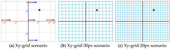 - Xy-grid-20-px scenario (Figure 2c): 20 × 20 square grid. In this case, for a 480 × 360 px scenario, there are 24 squares per row and 18 squares per column.