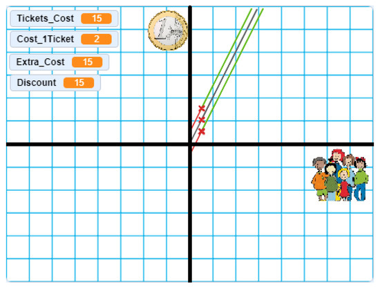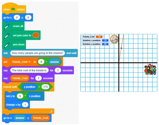 This problem applied to functions could then be understood as a linear function in which the slope (m in a linear function y = mx) would constitute the cost of the ticket (6 €), the independent variable x would be the number of friends, and the dependent variable y would be the total cost to go to the cinema. Based on this idea, a Scratch program could be proposed as follows: