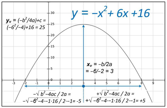 An example of the discussed characteristics is shown in Figure 5 for the function y = −x2 + 6x + 16. This activity will attempt to discern the position of the vertex based on its expression by approximating the solution from a basic parabolic motion problem. Although students will not perform this kind of problem in physics until the first year of Baccalaureate, it will serve to acquire the basic knowledge of its operation.