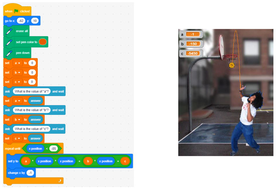 Starting from a simple Scratch program and a suitable scenario, the launching of a ball can be simulated by generating a parabola, as shown in Figure 6. The challenge would be to ask students to obtain adequate values for coefficients a, b and c after studying aforementioned aspects.
