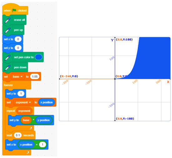 The related program in Scratch, which is provided to students, is based on a recursive program to multiply the base of the expression (1.05), the required times by the exponent (x). The program draws with the extension “Pen” the area below the exponential curve, which saturates the Scratch screen approximately for an x = 100, as shown in Figure 7. This value can be exactly calculated applying logarithms, as presented in (6).