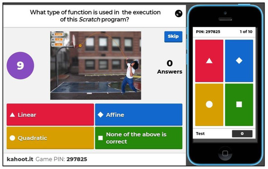 - Standardized test: At the end of the activities’ development, an individual standardized test will be proposed to the students, based on multiple choice reagents and a single closed response. It is intended to evaluate competences of understanding and application of terminology and methods and procedures, thus checking that the student has understood the activity both in its development and the related conclusions. Provided that the computer resources of the center are sufficient, a computer can be used by each student. Thus, for example, using the Kahoot! program (see example in Figure 8), reagents can be presented including images and videos if required, offering immediately the final result.