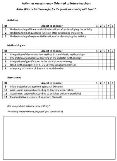 After carrying out the considered activities and the assessment presented in Table 2, the survey shown in Figure 9, based on a 5-point Likert scale (1: strongly disagree; 2: disagree; 3: neither agree nor disagree; 4: agree; 5: strongly agree), was passed to the students.