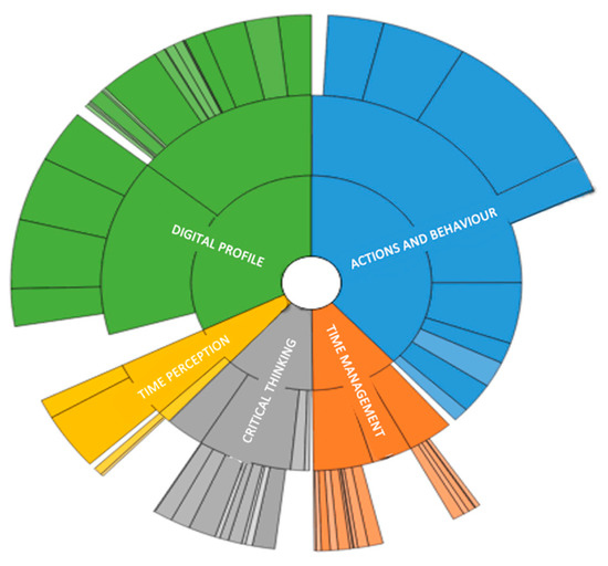 A total of 14 sessions were held, which were recorded in audio format, transcribed, and loaded into Nvivo software (V.12, licenced to the research group) for coding and analysis, according to a system of categories drawn up by three researchers using an inductive procedure [34] who took part in the coding process. These categories were structured according to five dimensions (see Table 1) related to the adolescents’ Digital Profile, Online Behaviour, Online Practices, Scenarios, Time Management, and Critical Thinking (focusing on self-perceived risks).