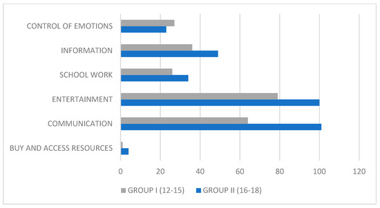 The uses that adolescents claimed to make while online were classified into six codes according to the participants’ discourse, with a total of 544 references. Considering the different apps and tools they stated they use and the intergroup study referred to in prior studies [35] they most often use instant messaging through apps such as WhatsApp and Instagram, with entertainment and communication with peers being the two main reasons for their use, with no differences between the sexes. The intergroup study, considering the two age brackets specified earlier, revealed (see Figure 2) that younger adolescents are the ones who use it for entertainment and even to control their emotions; that is, when they are online they feel (paradoxically) disconnected from tasks and obligations, whereas as they mature, they link its use to the need to communicate, enjoy themselves, keep up to date, or even improve their school performance.