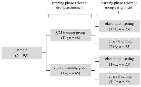 Participation was based on self-selection in the first instance, as our study was carried out as part of an elective curricular course on learning strategies. Accordingly, the participants had to spend their free time, so we offered each weekly session at a total of five different time slots (different days of the week and different times of the day). After all participants had individually decided in advance on the most suitable time slot for them, they were permanently assigned to it for the entire duration of the study. Afterwards, we randomly assigned each of the five time slot groups to one of the two training conditions, resulting in a total of n = 48 participants in the T+ and n = 45 participants in the T− groups. These participants were again randomly assigned to one of the two setting conditions (learning material not available/retrieval [R] vs. learning material available/elaboration [E]), so that the four final quasi-experimental groups were created (see Figure 1). The minimally unequal distribution of the participants in the respective groups is due to a dropout of a total of five subjects during the study period.