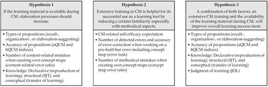 - Furthermore, we expect that extensive training in CM is helpful for its successful use as a learning tool [44,45,95] by inducing a certain familiarity, especially with methodical aspects. This effect should become particularly evident in comparison with another condition in which the participants only receive a short introduction to the CM strategy. Accordingly, we expect participants who took part in an extensive CM training to show higher CM-related self-efficacy expectations, to achieve better results in analyzing and editing given concept maps, as well as to make fewer methodical mistakes when creating own concept maps.