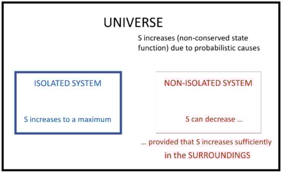 - The specific case of an isolated system should be addressed here. Being unable to interact with the rest of the universe when a process takes place in an isolated system will not affect the entropy of the rest of the universe. In this case, the entropy variations of the system will equal the entropy variations of the universe, which is not the case in non-isolated systems. Some activities could be proposed here where the students practice the new reasoning, consisting of labeling hypothetical processes as spontaneous/impossible in non-isolated/isolated systems, on the basis of the timely progression of the entropies of the surroundings and the universe.