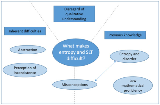 Starting from the obvious, entropy is a remarkably difficult concept to teach because it is extremely challenging to understand. This intrinsic feature has been repeatedly asserted in the literature [13,14,15,16,17]. The SLT, being based on this elusive property, is also troublesome. Apart from the inherent difficulties linked to the concept itself, and to some point as a consequence of it, some other challenges arise in the academic context as related to the teaching approach. The inherent difficulties linked to the SLT may discourage the qualitative understanding of the concepts. This can be aggravated depending on the teaching approach, especially when instructors focus on mathematical procedures instead of true learning. Additionally, the student’s previous knowledge often plays a key role in the STL learning process. Figure 2 maps these difficulties, all of which will be described below.