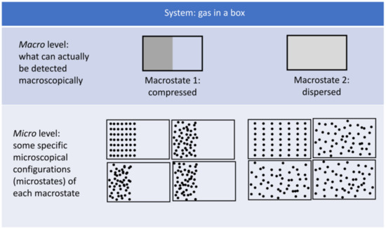 This reasoning can be further explained using Figure 3, which shows two macrostates of a gas system. In macrostate 1 (compressed), the gas is taking only part of the available volume, and in macrostate 2 (dispersed), it is taking all the volume. Since more space available for the gas implies a larger number of microstates, macrostate 2 can take place through much more microstates than macrostate 1. Therefore, macrostate 2 is much more likely to happen than macrostate 1. For this reason, a gas initially compressed will spontaneously progress to occupy all the available volume, but this process will never take place in the opposite direction. Given the direct link between the number of microstates and entropy, and the fact that macrostate 2 has the highest number of microstates, it has also the maximum entropy.