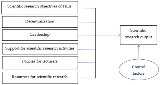 According to the literature review and hypotheses proposed, a research model was developed with the following factors: scientific research objectives of HEIs, leadership, decentralization, policies for lecturers, support for scientific research activities, and resources for scientific research. Additionally, to determine the difference between population groups in research output, the research model included the following factors (i.e., control variables): gender, age, degree and academic title, experience, position (managers or non-managerial lecturers), place of graduation (abroad or domestically), and scientific area. Figure 1 depicts the proposed research model.